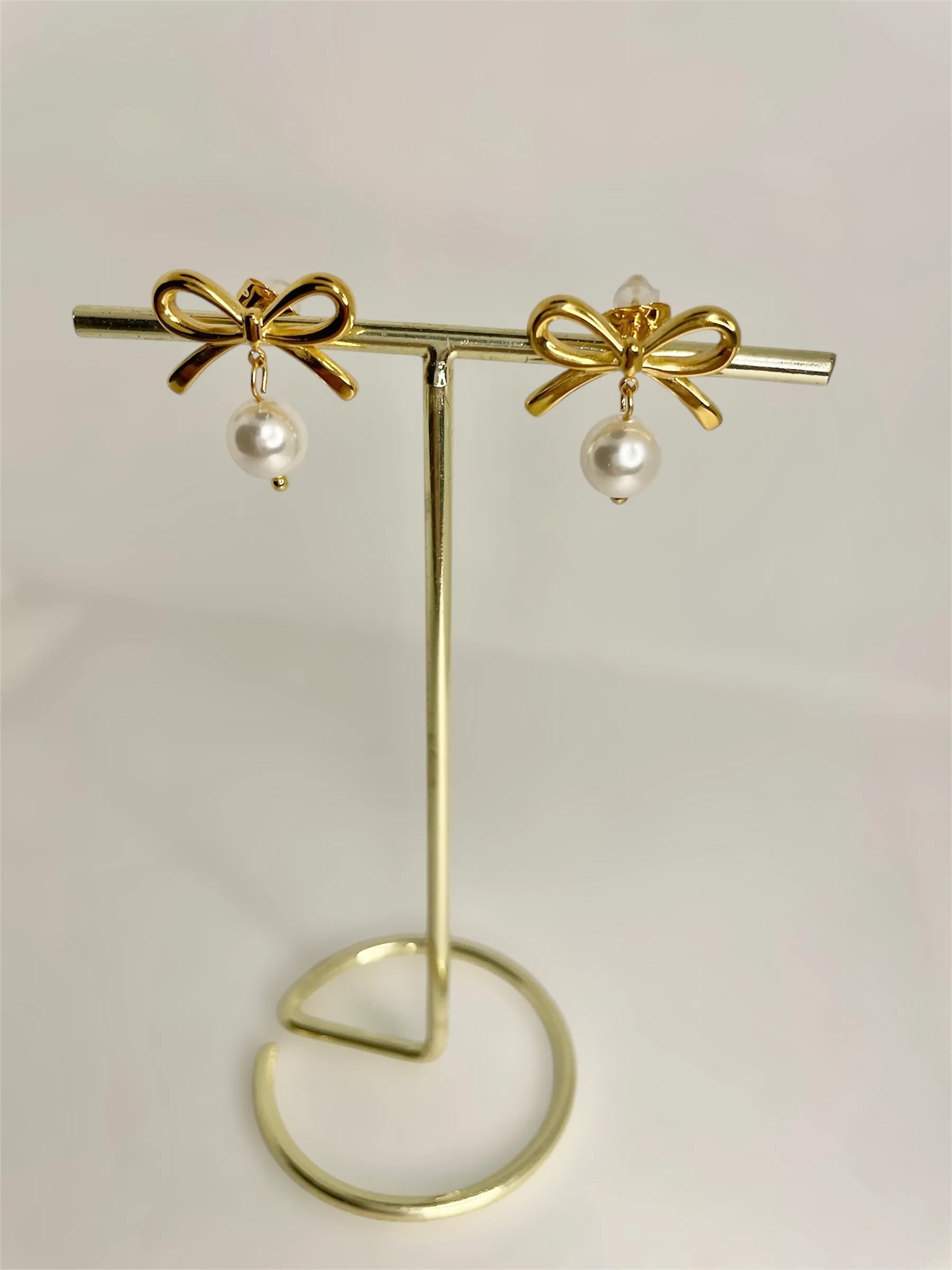 Gold Plated Bow Pearl Drop Stud Earrings