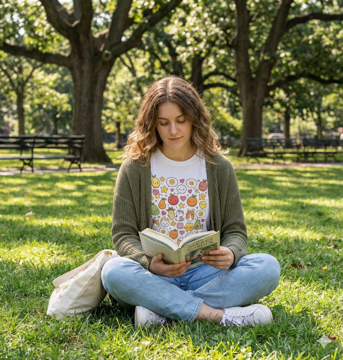 Designed to look like a vintage sticker sheet, this all-over print on a crisp white tee brings positive vibes to any outfit. Whether you are into Harajuku fashion, cottage core aesthetics, or just love cute cartoons, this shirt is a must-have.
