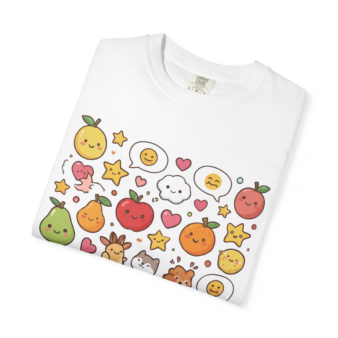 Kawaii Sticker Bomb Graphic T-Shirt | Fruit Doodle Pattern | Unisex White Tee | Harajuku Style Top